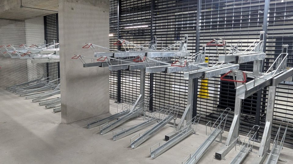 They have installed a mix of Sheffield Hoops on the floor level with additional racks at a 2nd level. The 2nd tier racks (as in photo) were needed to make up the total quantity needed of 120 spaces.