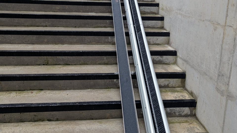 There are roughly 500 bike spaces, 1 for each of the 500+ apartments in phase 1. Access to the bike shed is via a broad bright open staircase which exits at ground level in a communal area. The stairs have bike rails for going up with a grip and going down have a brush to slow the bike down. Bikes could use the main car entrance although the ramp is a bit steep for bikes and no segregated path on ramp for bikes.