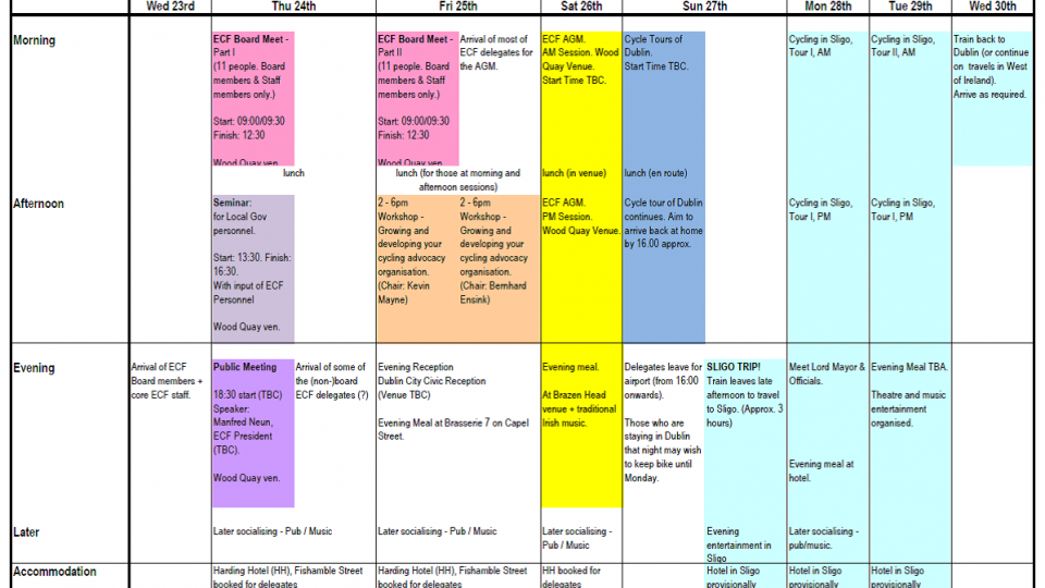 There will be optional member development workshops “Growing and developing your cycling advocacy organisation”. Delegates will be spilt so that they are working with groups of similar size and structure. Facilitated by K. Mayne and B. Ensink ECF. More details to follow direct to registered delegates when the mix of delegates is known. These will take place in the historic Wood Quay venue.